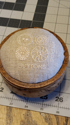 And one last swap item, a pin cushion. Honey Do made the wood bowl and I stitched the linen.
