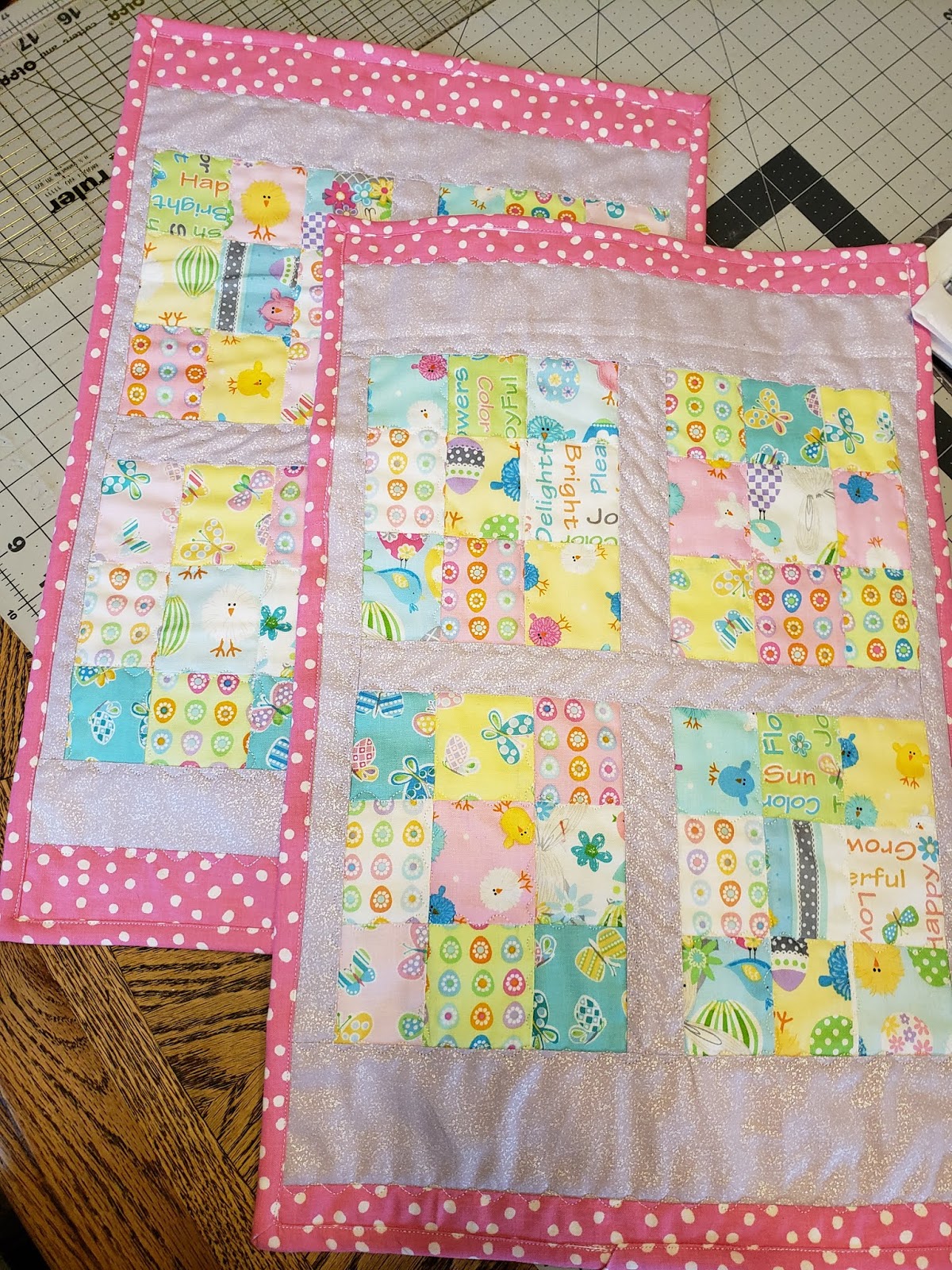 As leaders and enders, I've sewn together strips of Easter prints that were gifted to me by Susan.